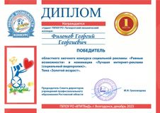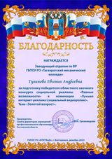 Филонов Георгий, студент 2 курса, группы 31МЛ Таганрогского механического колледжа, под руководством классного руководителя Тулиновой Е.А., занял 1 место в Областном заочном конкурсе социальной рекламы «Равные возможности». Целью проведения Конкурса является воспитание молодежи через создание социальной рекламы, формирование нравственных ценностей по отношению к людям с ограниченными возможностями, позитивного отношения к вопросам здорового образа жизни.