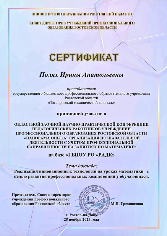 27 ноября преподаватель Полях И.А. приняла участие в областной заочной научно- практической конференции педагогических работников учреждений профессионального образования Ростовской области "Панорама опыта: организация познавательной деятельности с учётом профессиональной направленности на занятиях по математике".