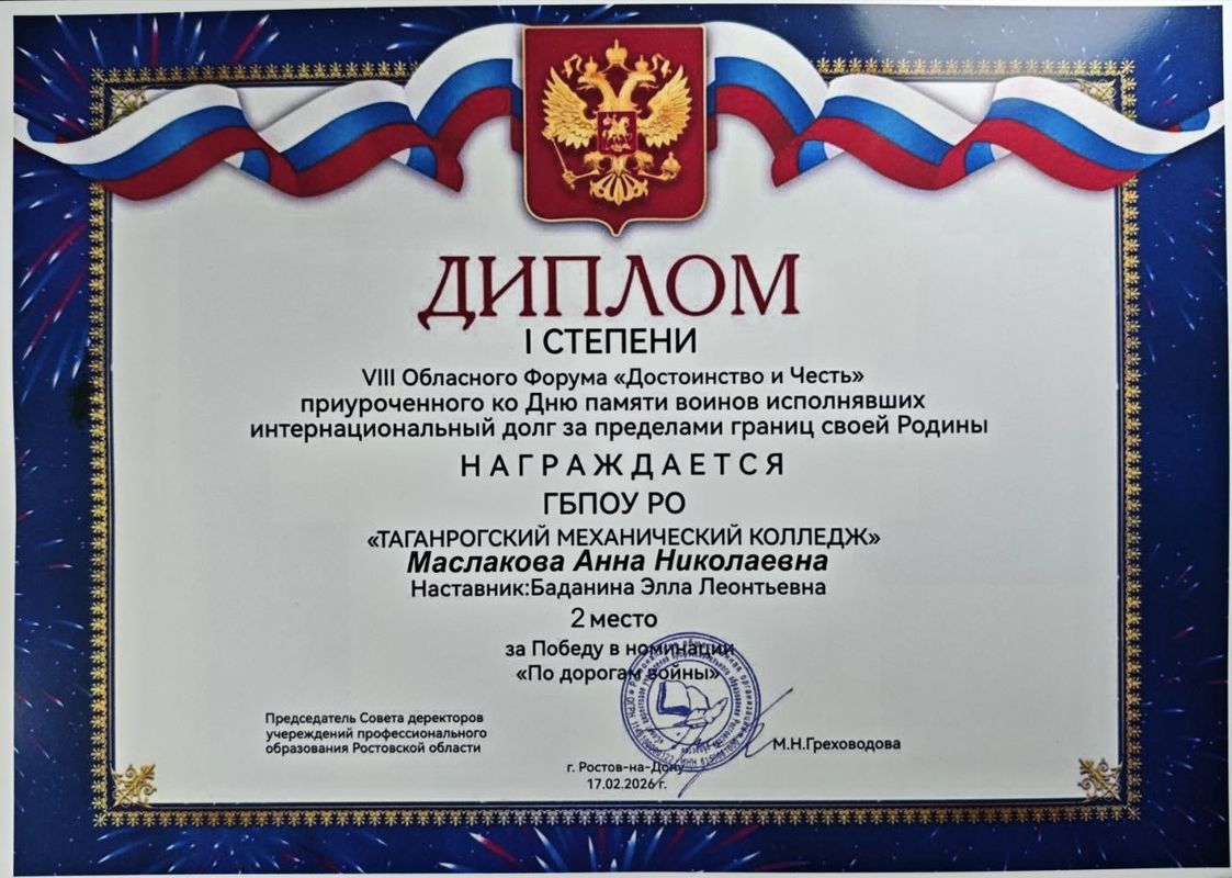 Маслакова Анна гр. 36 ППВ – Диплом I степени 2 место номинация «По дорогам войны»